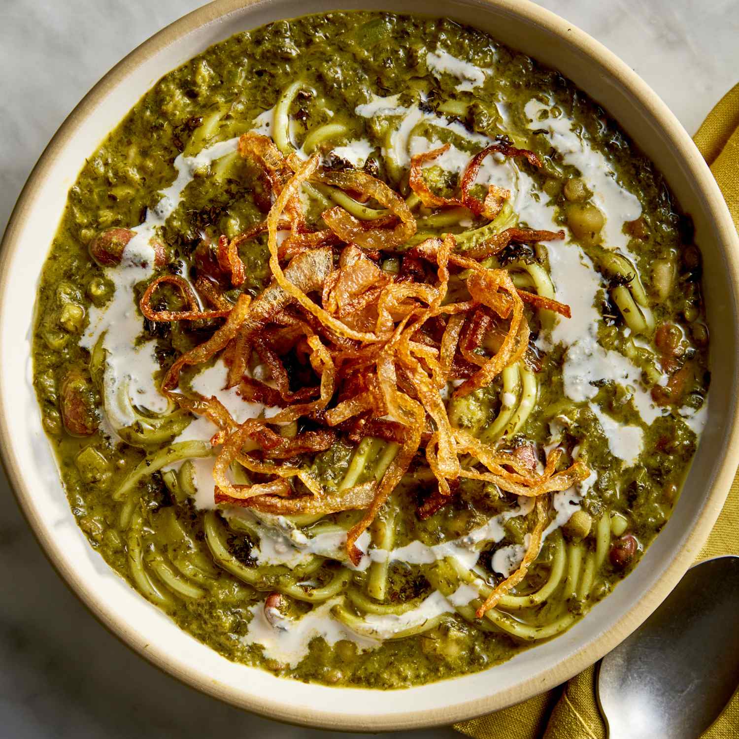 • Serve topped with fried onions, dried mint oil, and kashk.