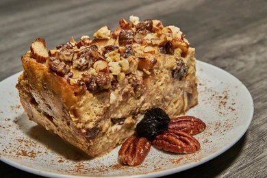 • Place a layer of bread in a baking dish. Add raisins and nuts.