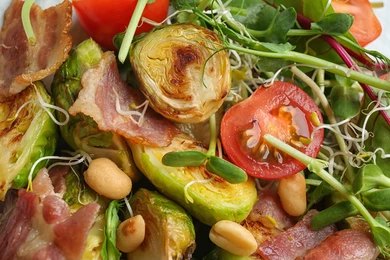 Brussels sprouts have long been a staple in European cuisine, particularly in Belgium and surrounding regions, where they were cultivated extensively from the 16th century onward. Traditionally served cooked, they have recently gained popularity in raw or shaved salad preparations.The addition of bacon reflects American culinary influence, where smoky flavors are often paired with vegetables for added richness. Cranberries, native to North America, became widely used in salads and holiday dishes for their sweet-tart brightness.This combination of Brussels sprouts, bacon, and cranberries reflects a modern fusion of European tradition and American comfort food flavors.