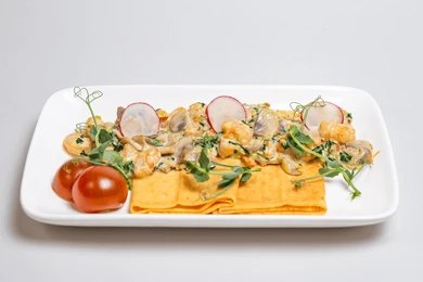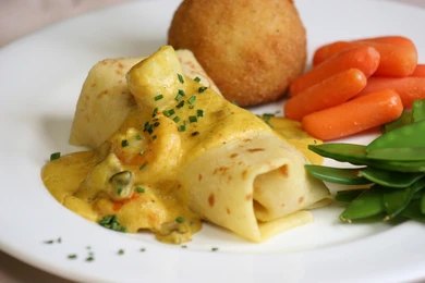 Crepes originated in France, particularly in the Brittany region, where they were traditionally made with simple ingredients like flour, eggs, and milk. Over time, crepes evolved into both sweet and savory dishes, becoming a staple in French cuisine.Seafood crepes gained popularity as French culinary techniques spread globally. Chefs began pairing delicate crepes with rich fillings such as lobster, shrimp, and scallops, often enhanced with creamy sauces like béchamel or velouté.